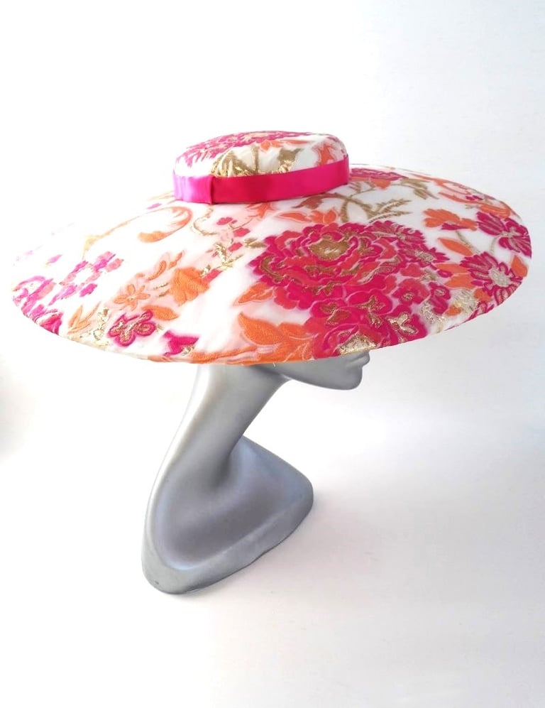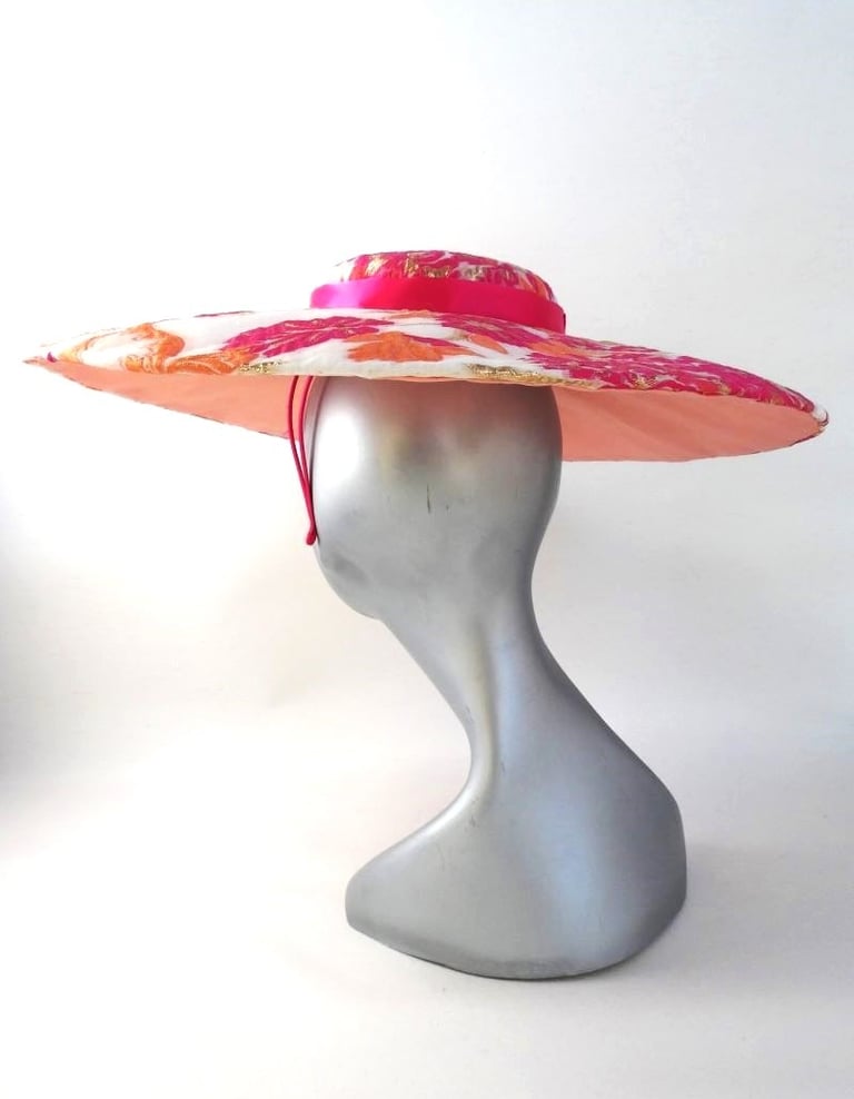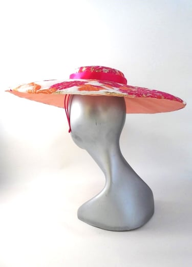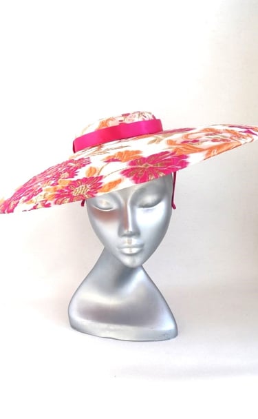 A one-of-a-kind, unique hat, a large brim boater covered with fabric that is embroidered with exquisite hot pink and orange flowers on an off-white background. The center crown is adorned with a fuchsia pink ribbon and the underside of the unqiue hat is trimmed with apricot satin.