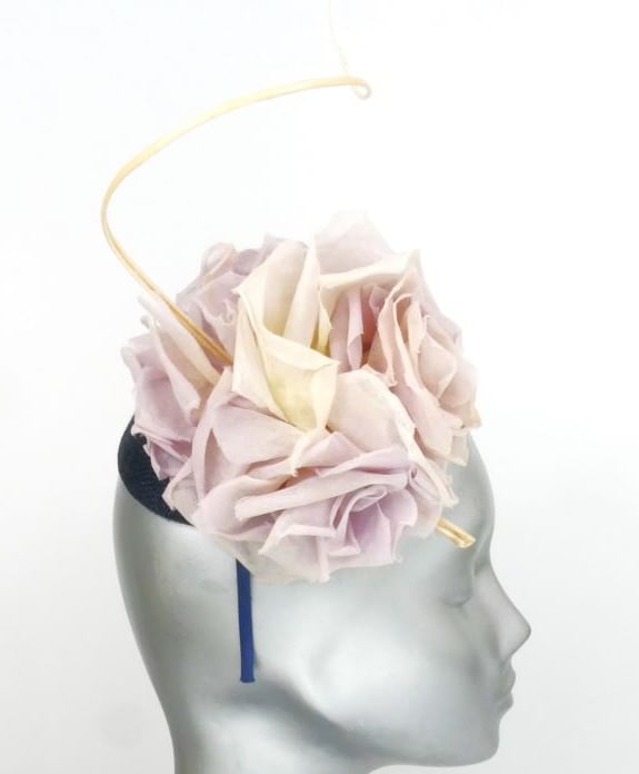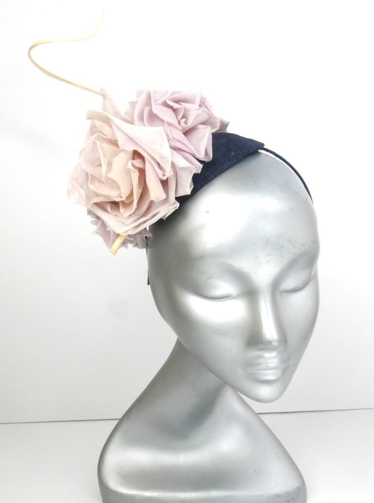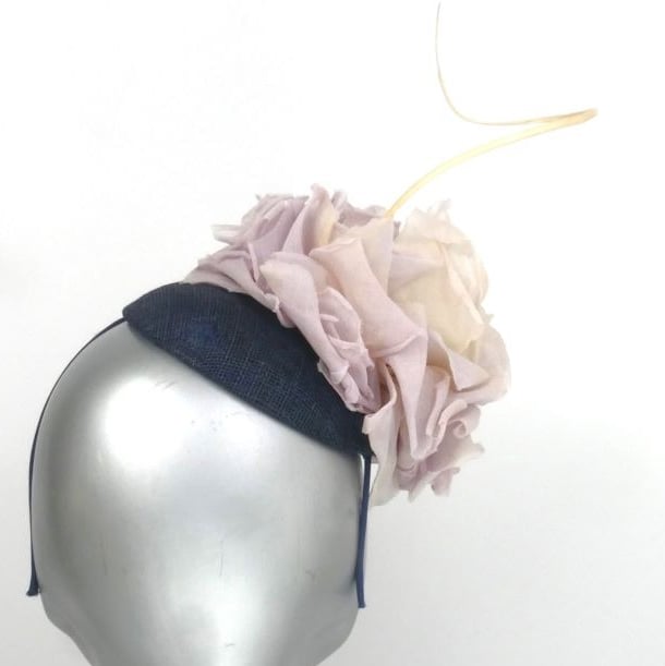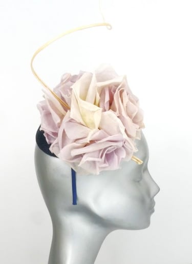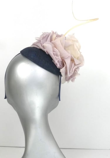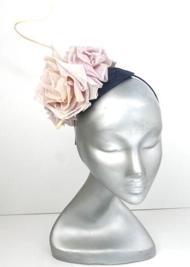 A charming fascinator that features a delicate cluster of lilac organza handmade roses, each intricately crafted. The hand-dyed organza gives the roses an airy, ethereal appearance, contrasting beautifully with the rich navy base. The base provides a timeless foundation mounted on a hairband, the fascinator offers a secure and comfortable option. Suitable for seasoned hat wearers or hat newcomers. Perfect for weddings, race days, or special occasions, this piece blends classic elegance with modern femininity.