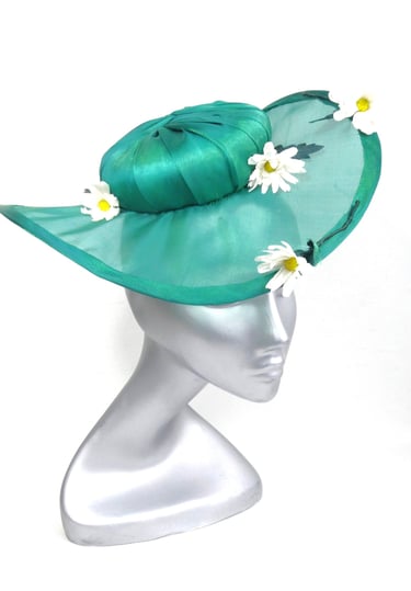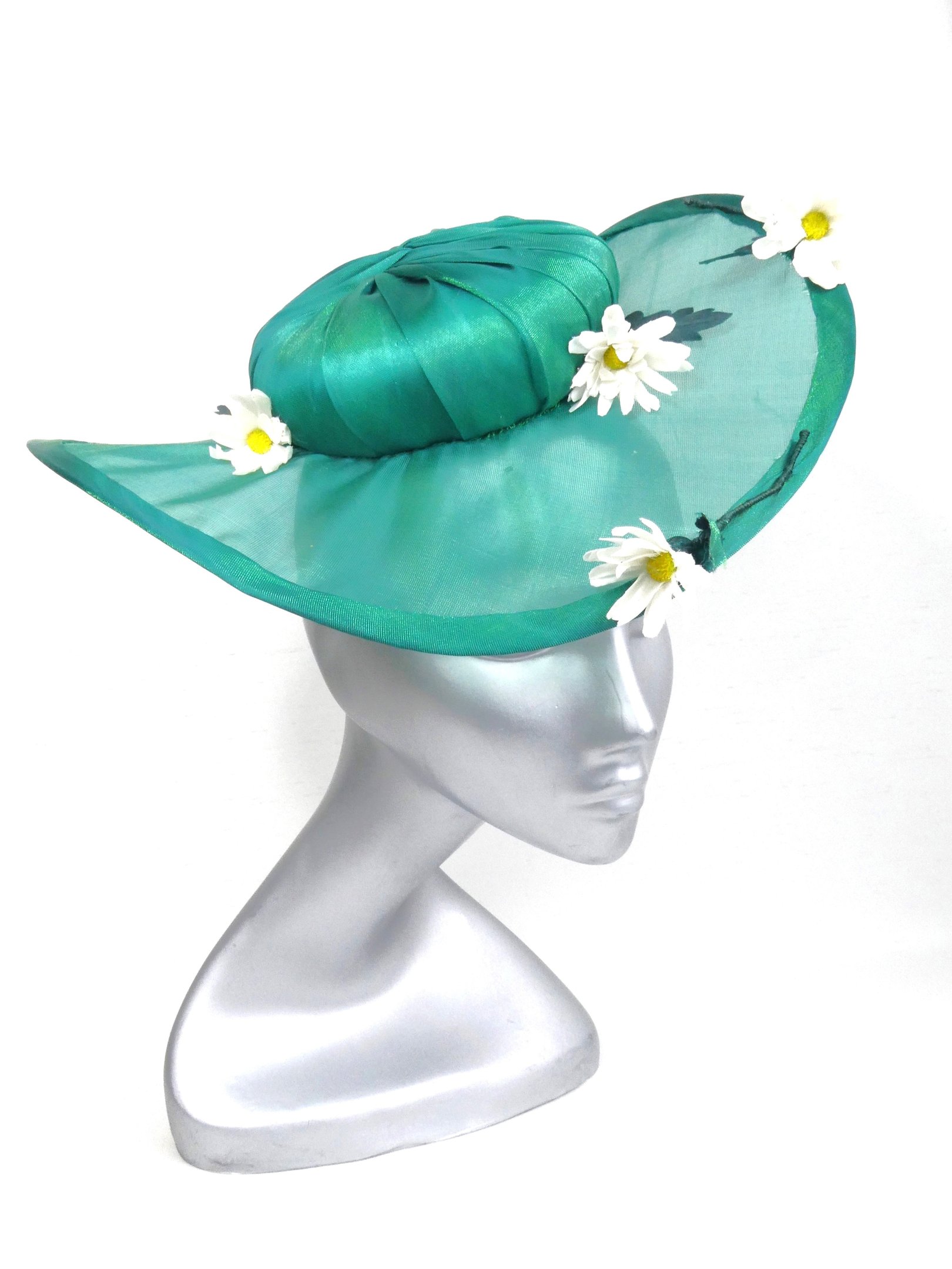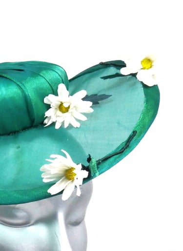 A charming emerald green brimmed hat, made from a sheer light weight fabric, with a central button covered in coordinating fabric. Adorned with five handmade silk daisies, the tiny flower with huge charm. The daisies are scattered over the hat to mimic flowers being thrown on a stage, celebrating a performance.