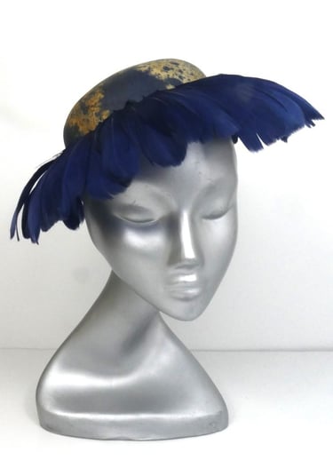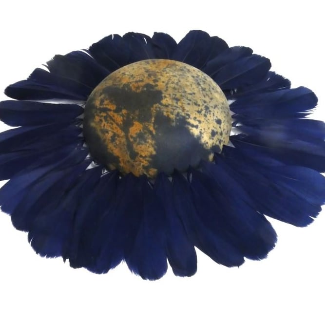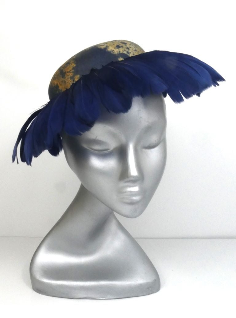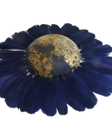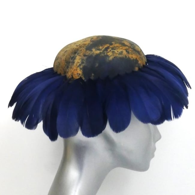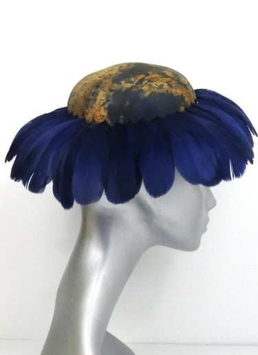 A distinctive hat, two-toned leather crown, blocked from tan and blue leather. The crown has a smooth, polished finish, creating an elegant contrast between the warm tan and cool blue shades. The brim a ring of soft blue feathers that encircle the hat, adding a touch of whimsy and a light, airy texture. The brim is a ring of deep blue feathers, complimenting the blue leather on the crown, giving the hat a unified yet unique look. The overall style has flair and charm, perfect for standing out in a crowd.
