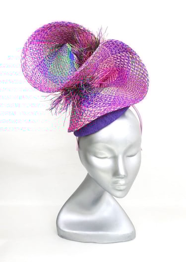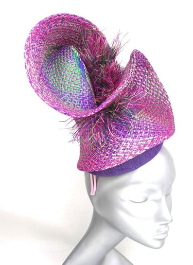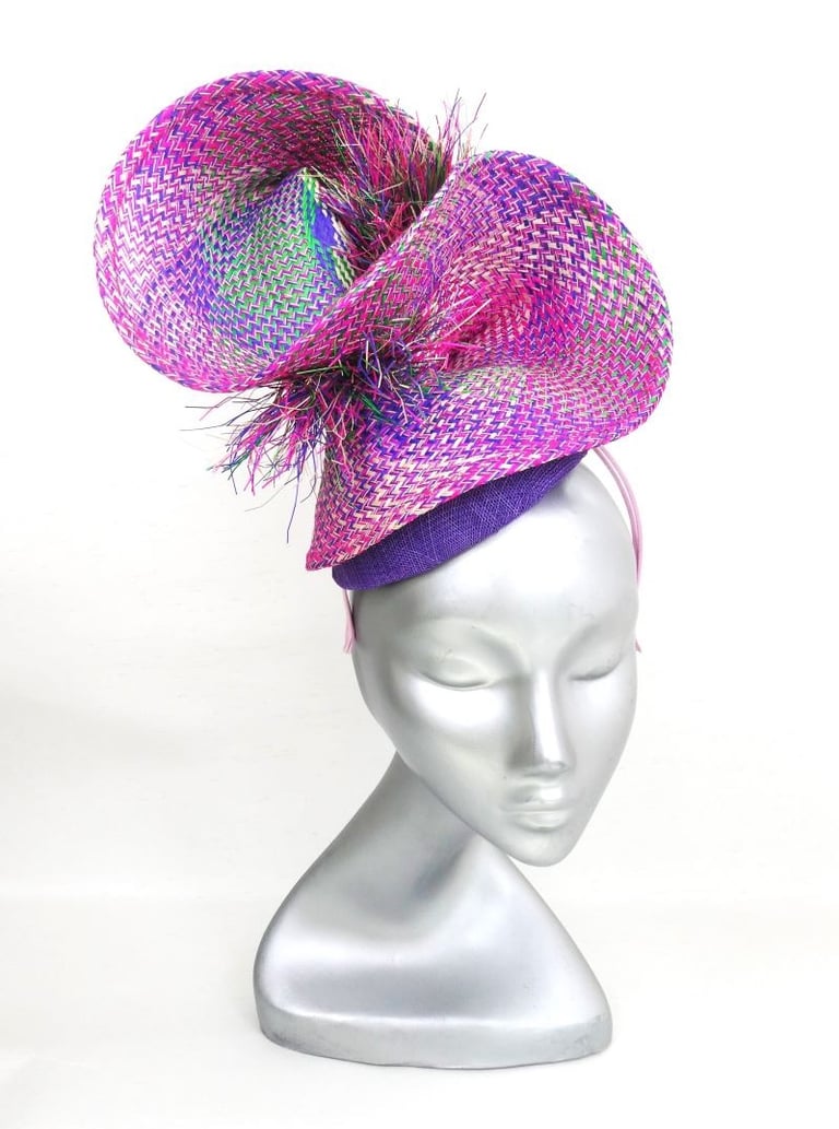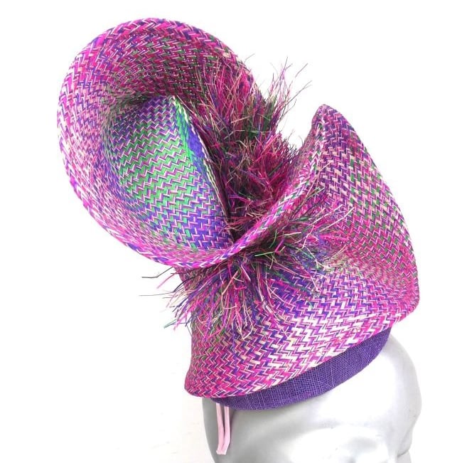 This colourful straw hat is not only made from sustainable fabric, it is sure to turn heads. Sculpted to give 360-degree design, a hat that has interest at every angle. A stunning design that gives extra height, a charming addition to complete any outfit.