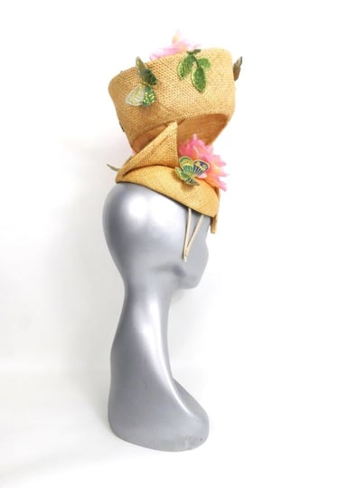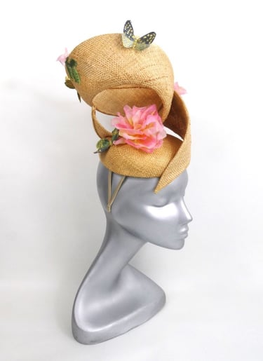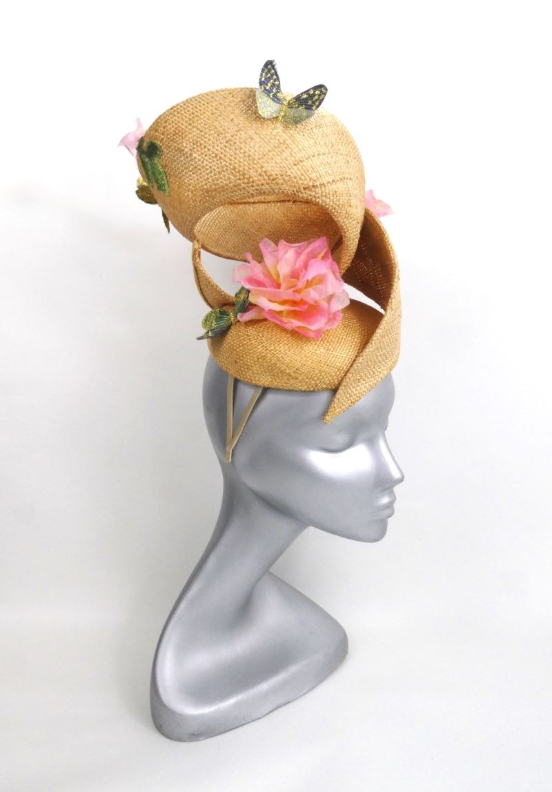 Lightweight and easy to wear made from sustainable materials, secured to the head by a two metal headband. A playful, elegant swirling fascinator, it has an airy and whimsical charm. Crafted from vintage straw, it has been embellished with three handmade, pink silk roses and appliqué leaves and butterflies. This fascinator has 360-degree style, looking elegant from every angle.