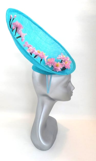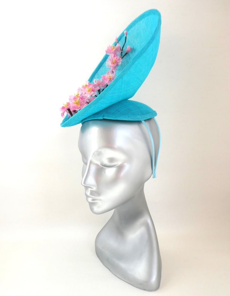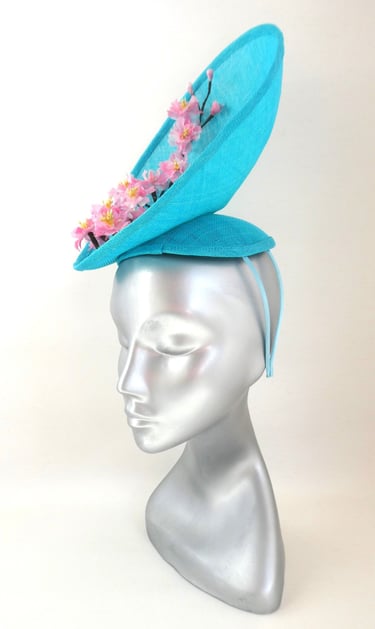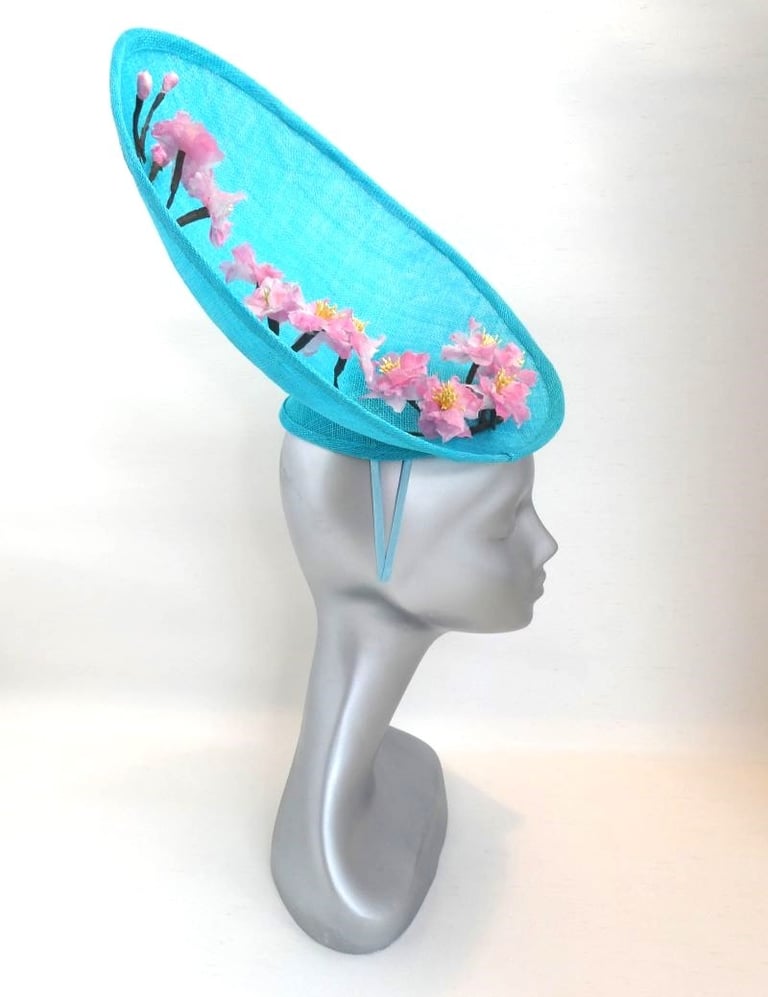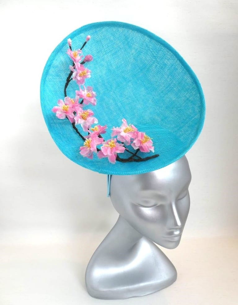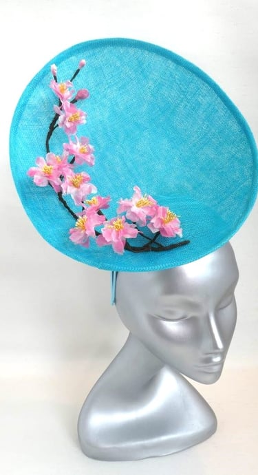 This race day hat / fascinator has stand out style that will turn heads. The large turquoise blue oval is mounted on a circular base. The turquoise oval sits up from the forehead giving height and impact. The race day hat / fascinator is embellished with a stem of handmade silk cherry blossoms.