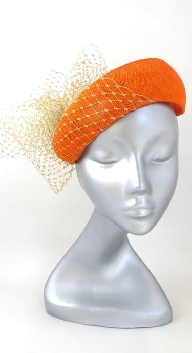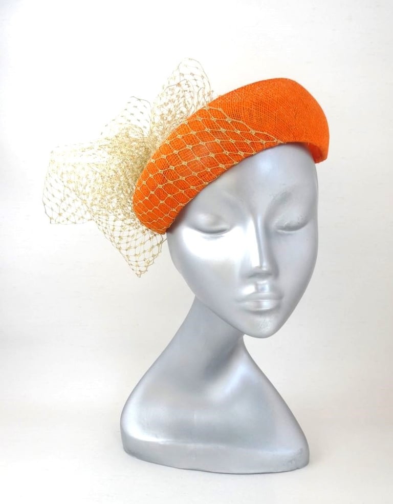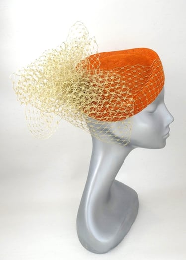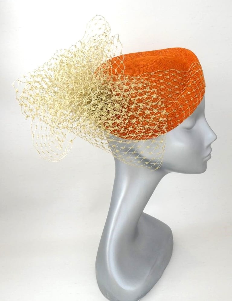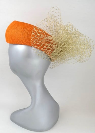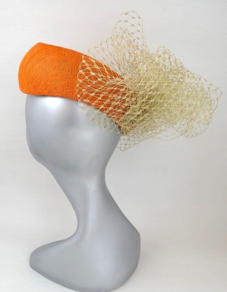 A vibrant orange fascinator, that has an indented feature on the top of the hat. The orange fascinator is beautifully adorned with a large cloud of gold metallic veiling to the right and rear of the fascinator.