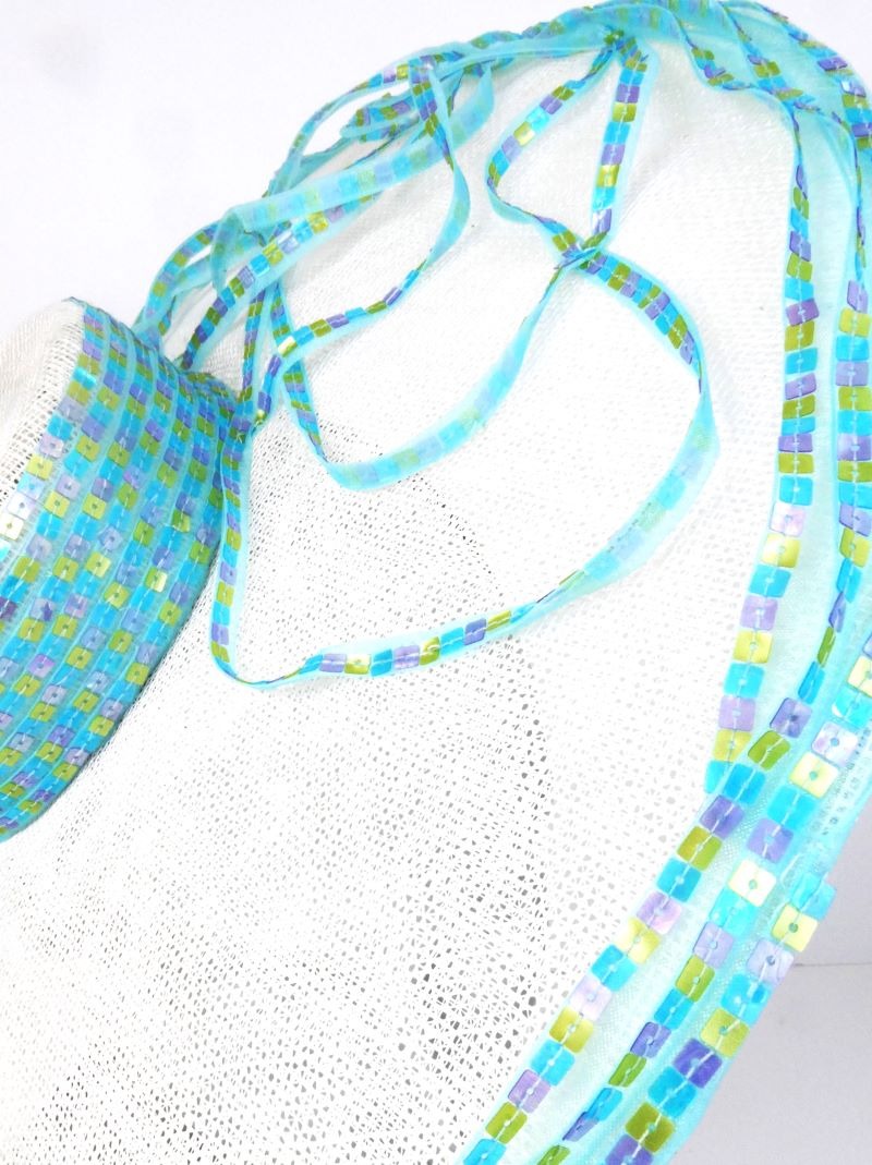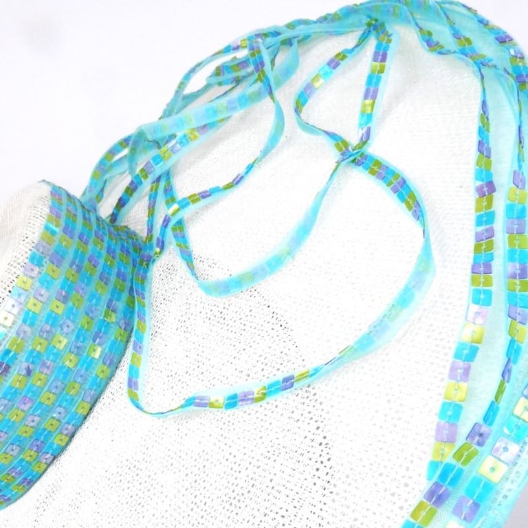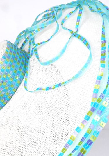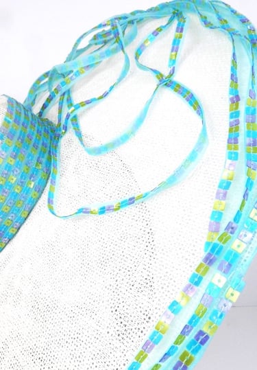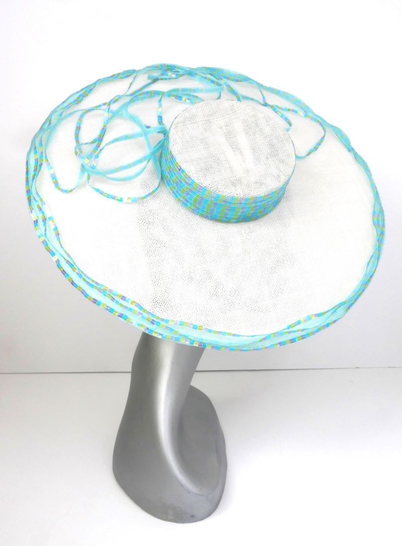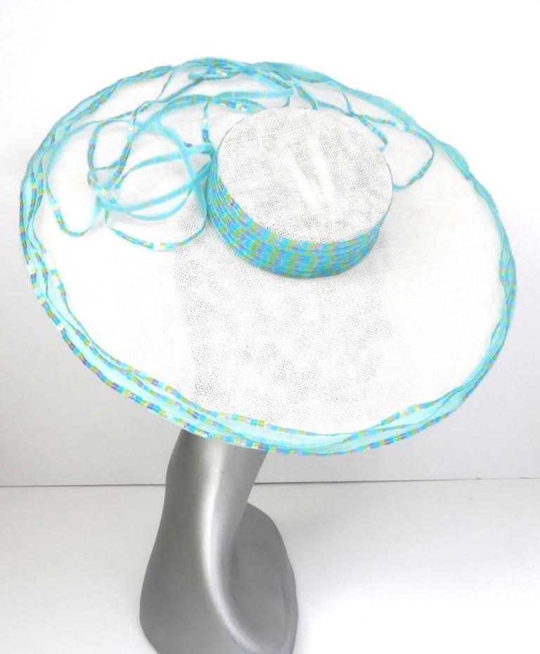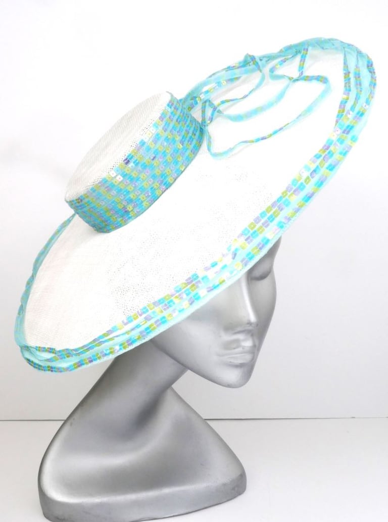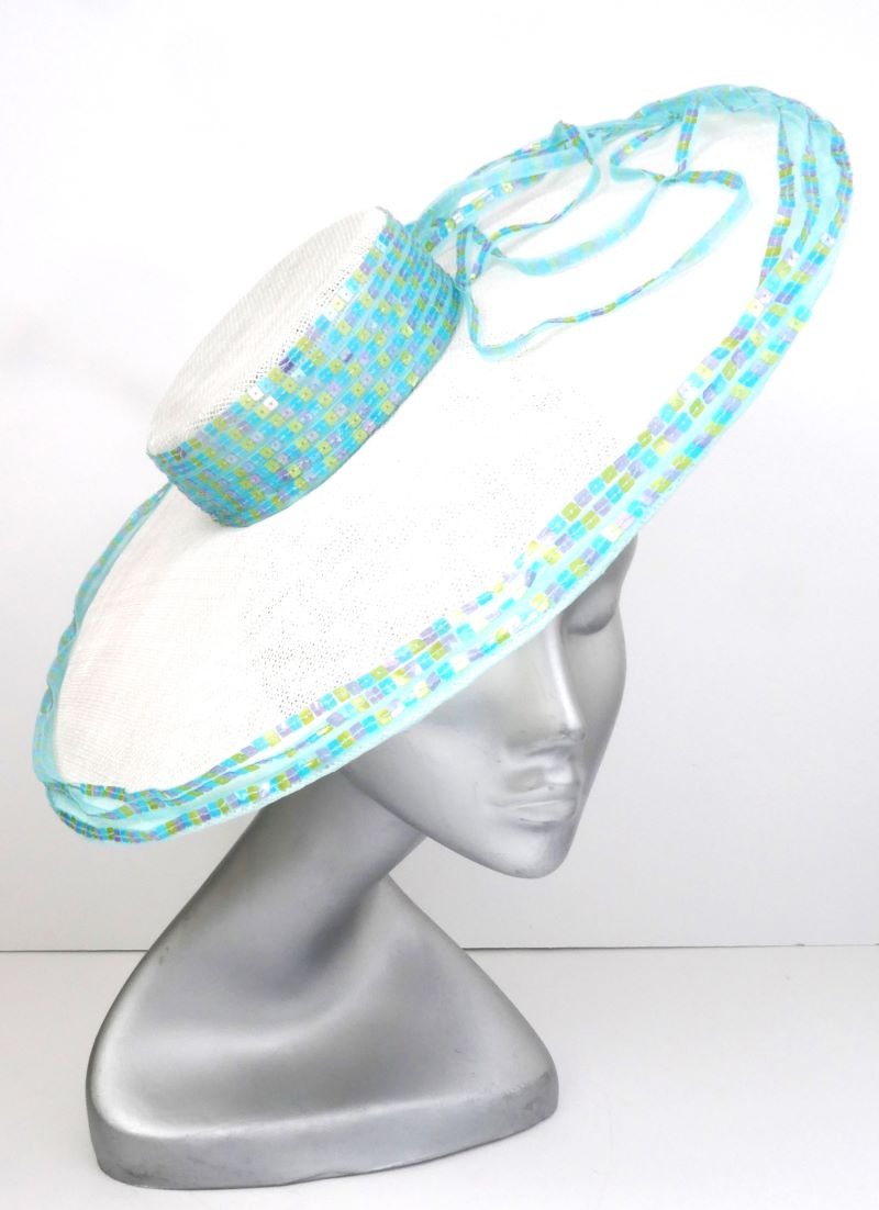 Adorning the crown's side, outer edge of the brim, and a selected section of the brim's surface, meticulously hand-stitched pastel square sequins that shimmer subtly. These delicate embellishments, in soft hues of pink, yellow, and baby blue, catch the light gracefully, adding a touch of understated elegance to the hat's pristine white canvas.