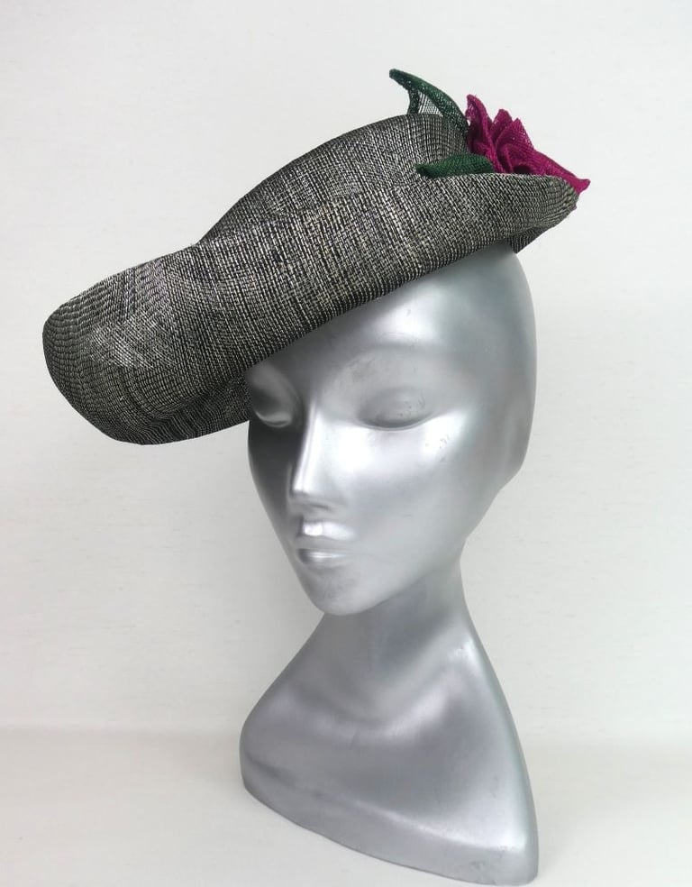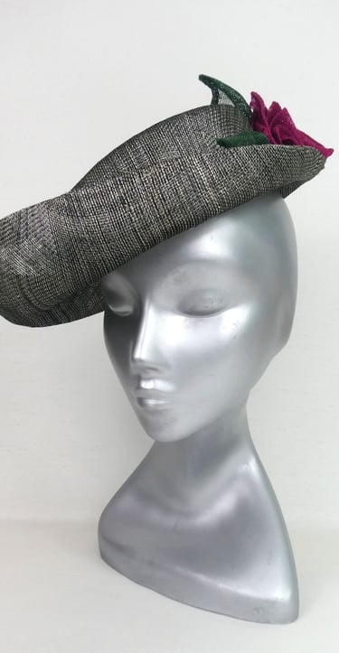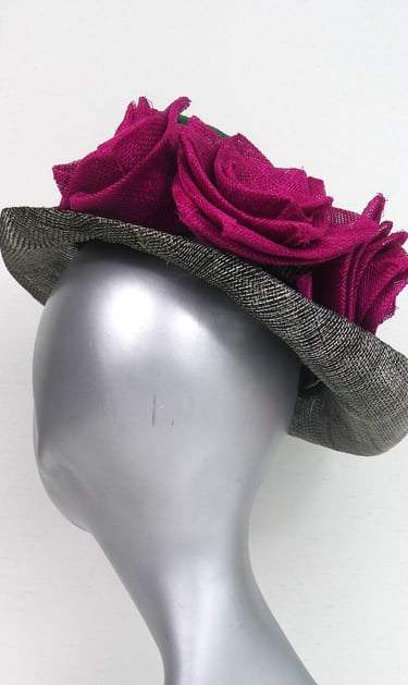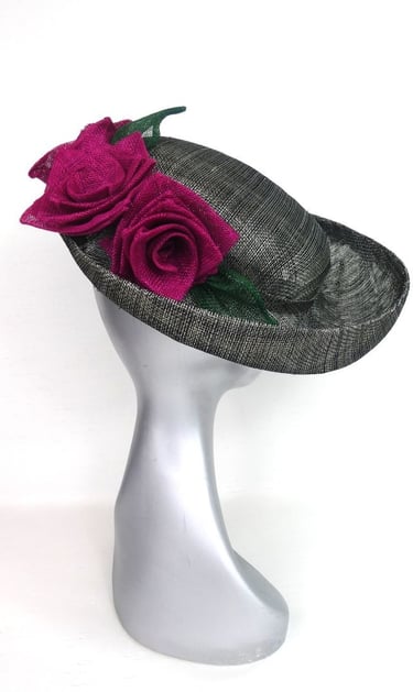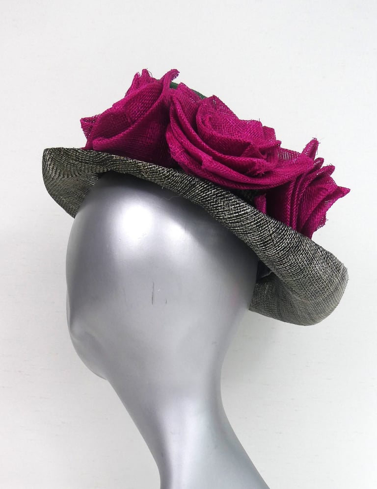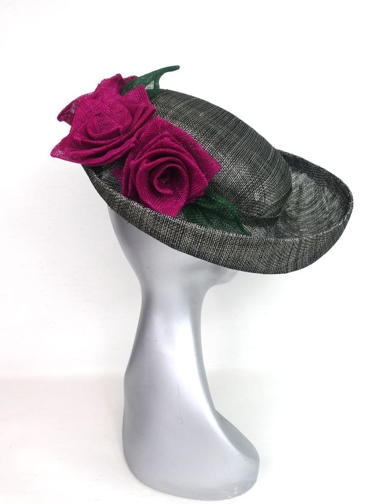 A stylish wedding hat with a sweeping upturned brim. Made from cross-woven black and cream sinamay to give a mottled shimmering grey effect. Embellished with three fuchsia pink sinamay roses, with green leaves, to the right and back of the wedding hat.