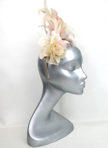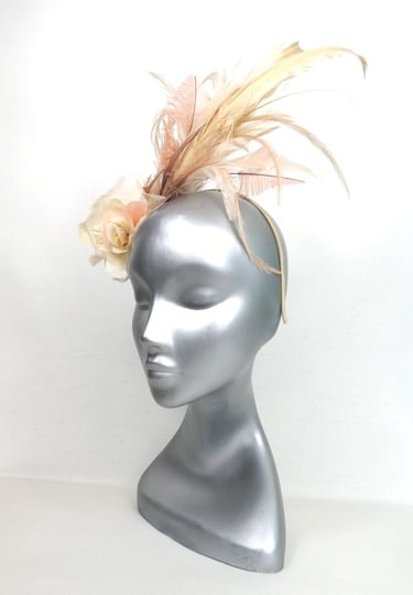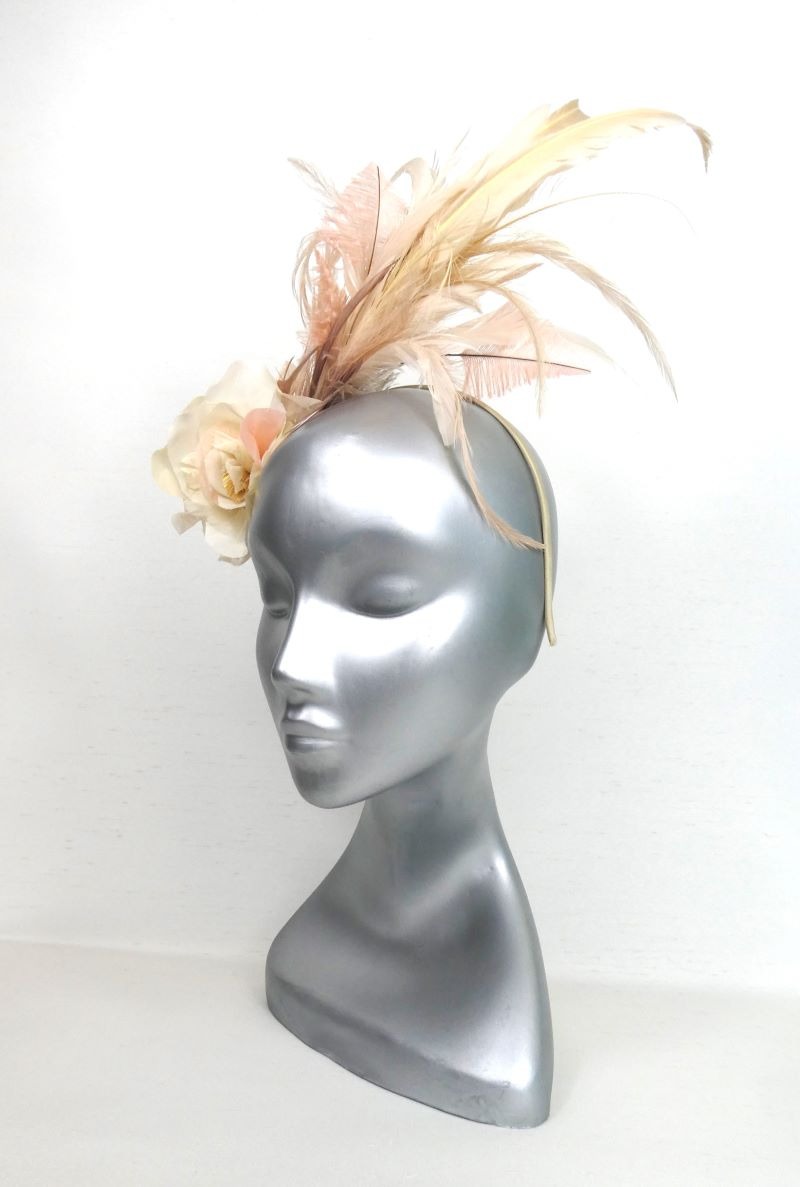 A striking cream, pale pink and cream feather fascinator. Embellished with a fabric rose that sits to the right of the forehead, framing the face. A fascinator that suits most wearers. A great option as a bridal headpiece.